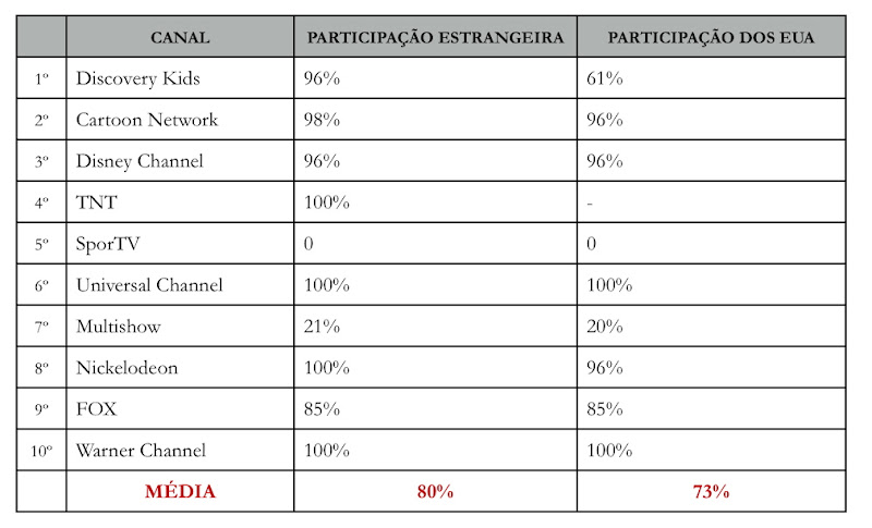 Sete desses canais pertencem a empresas estadunidenses, os outros três (Multishow, SporTV e Universal Channel) fazem parte da Globosat, a sucursal a cabo das Organizações Globo. A revista o Viés analisou a programação fixa desses dez canais e chegou a este resultado: