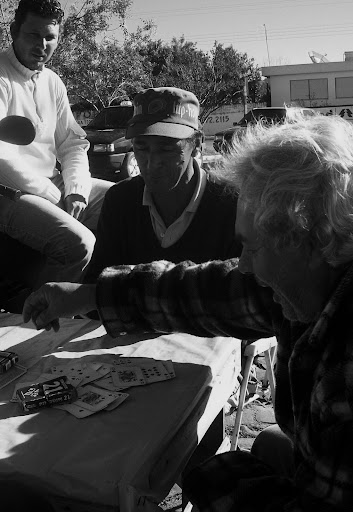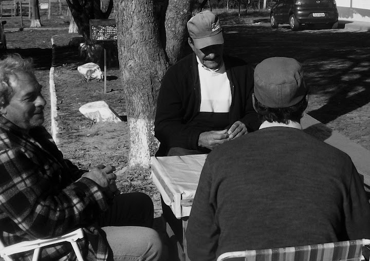 O frio não parecia incomodar os quatro colegas e amigos que jogavam cartas sentados ao sol e com o sol sentado sobre suas cabeças e gorros. Jurandir, Iramar, Jackson e Arnóbio, entre uma jogada e outra, conversavam e posicionam cartas sobre uma mesinha improvisada. Falavam sobre o dia, sobre o frio, e principalmente, sobre a profissão que exercem.