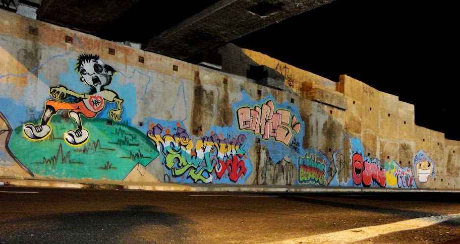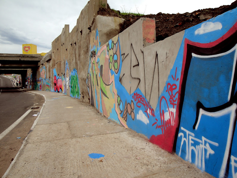 São as rachaduras da parede, também, que fazem a ligação entre os vinte trabalhos – alguns ainda em execução – dispostos do início ao fim do túnel e dão coerência ao trabalho, apesar de toda a diversidade que se encontra de uma ponta a outra. Entre personagens, letras estilizadas e uma variedade de cores, algumas marcas características que são facilmente identificáveis em outros locais da cidade: a antiga FPK, o ser robótico de Brasiliano, os personas de Vico, do CO-RAP. Chama a atenção também o trabalho de Daniel (TOSE), que reuniu no seu espaço as tags (assinaturas) dos que ali estavam pintando e outras mais, gerando um espaço que une um pouco da sofisticação do grafite com a essência do pixo.