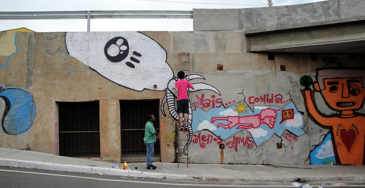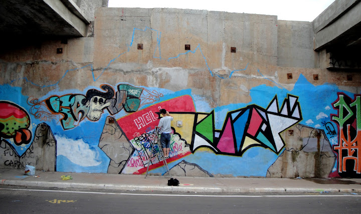 Entre tintas, corantes, latas de spray, rolos e bandejas de mistura que se espalhavam pela calçada estreita e transitavam de uma ponta a outra conforme as atividades de cada grafiteiro, a parede interna do túnel foi tomando vida, à medida que o cinza inconstante do reboco era coberto de cores e formas. Cauê explica que, a princípio, só iria pintar quem tivesse participado da exposição das latas no primeiro dia. Mas como a intenção é agregar, todos os artistas que se propuseram a pintar tiveram o seu espaço, e cada um teve a liberdade de usá-lo como bem entendesse.